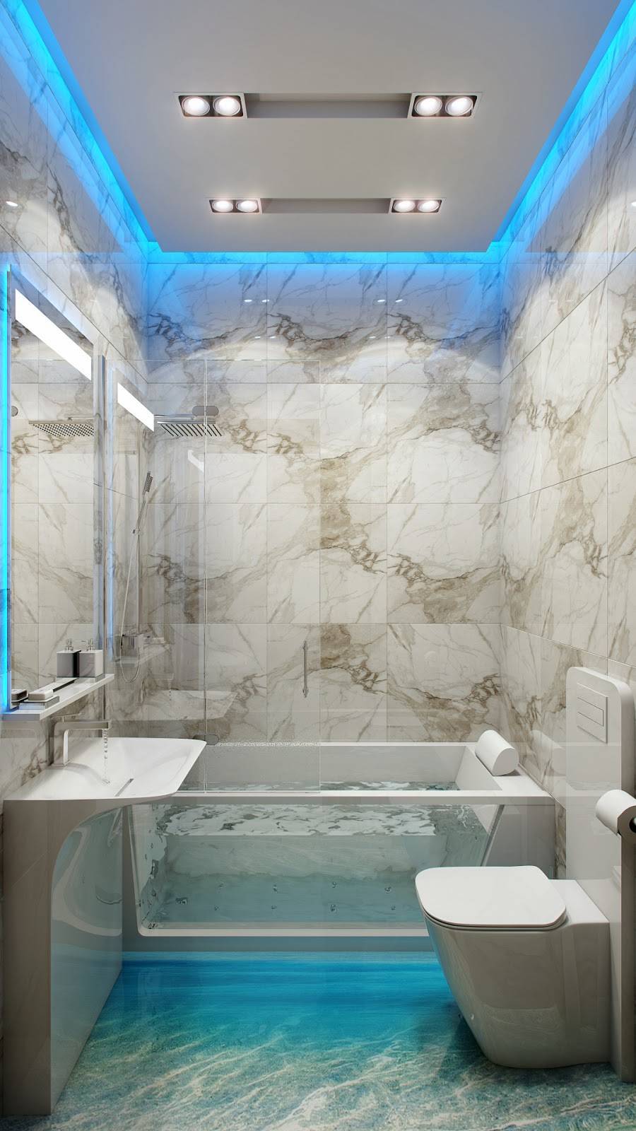 Очень необычно выглядит ванная со встроенной подводной подсветкой.
