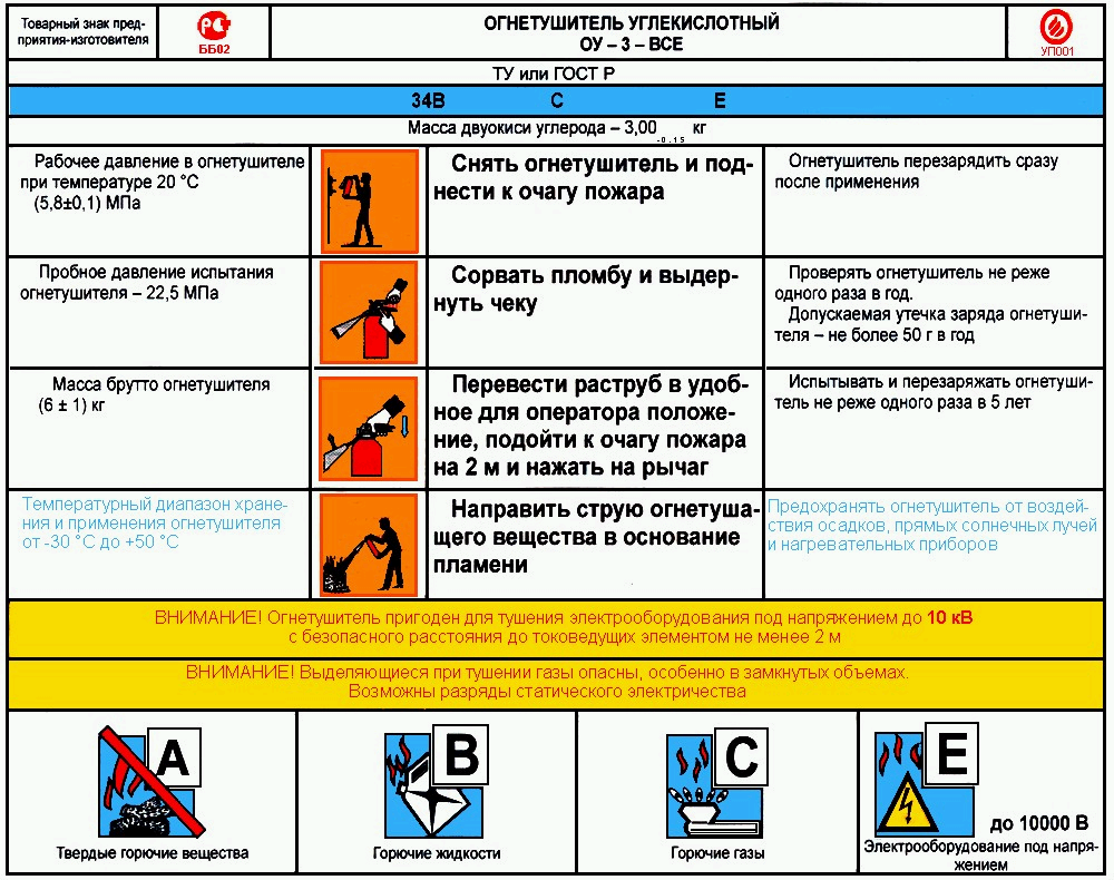 ОТВ, состоящее из углекислоты (CO₂, двуокись, диоксид углерода), – это стандарт для возгораний кл. E. Принцип действия: вытеснение кислорода из обрабатываемой зоны возгорания и критическое охлаждение (заряд при выходе имеет -70 °C).