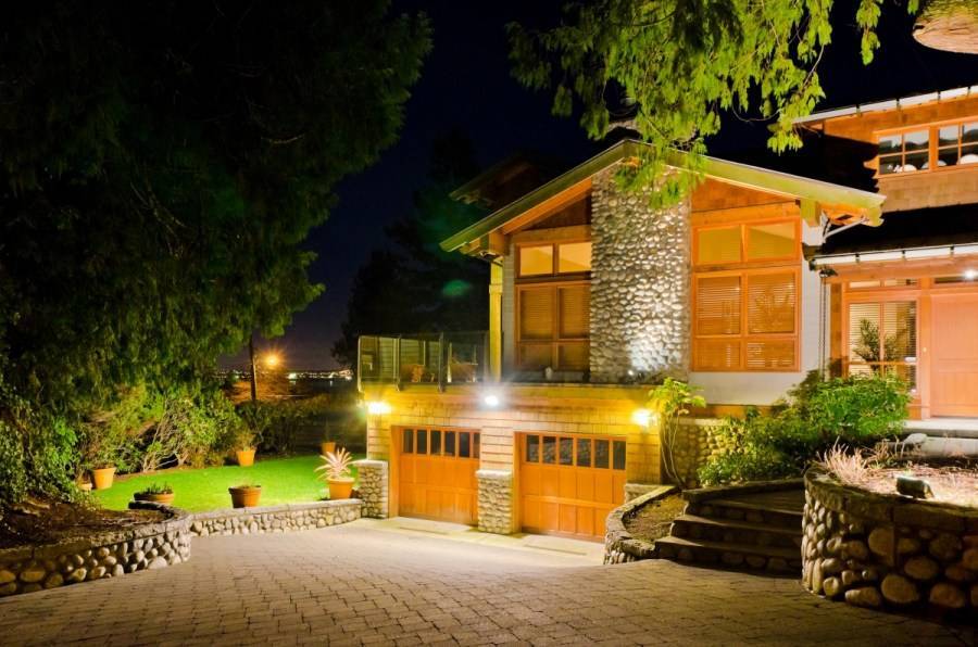 - Для безопасности наилучшим вариантом будет установка освещения вдоль садовых дорожек, на входе в участок, осветить калитку и ворота, а также установить наружное освещение усадьбы при входе в дом.