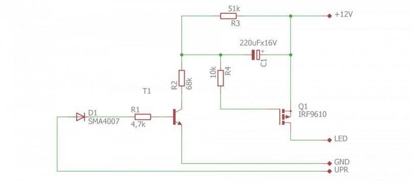 Достоинством схемы является ещё и то, что она подсоединяется вместо штатного выключателя или пакетника, нет дефицитных деталей, и для управления лампой (лампами), можно использовать низкоточные малогабаритные выключатели.