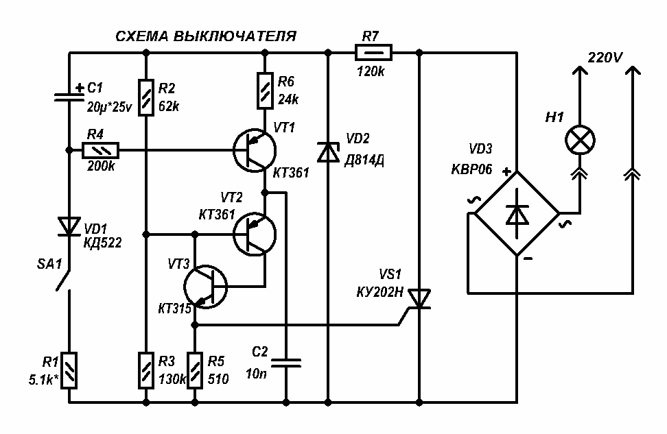 Закрыт и симистор VS1.В результате зарядки конденсатора С2 напряжение, приложенное к динистору VS2, постепенно увеличивается, и он начинает открываться и открывать симистор VS1 в каждом полупериоде сетевого напряжения на все большее время Яркость свечения лампы постепенно растет. Чтобы замедлить этот процесс, параллельно конденсатору С2 подключен интегратор на транзисторе VT 1, охваченном обратной связью через конденсатор СЗ и резистор R5.При указанных на схеме номиналах элементов яркость лампы достигает максимума через 10 с после замыкания контактов выключателя SA1. Это значение можно изменить, подбирая резистор R5. Резисторы R2 и R3 нужны для разрядки конденсаторов, параллельно которым они подключены, после выключения лампы, что подготавливает устройство к новому включению.Установившееся значение напряжения на лампе около 200 В при напряжении в сети 230 В. Это немного снижает ее яркость, но значительно увеличивает срок службы.