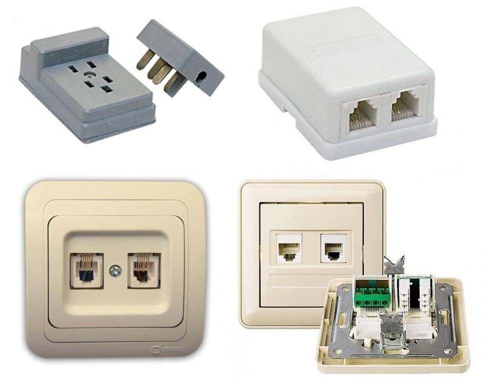 Производители делают несколько видов телефонных розеток, старая конструкция РТШК-4 с развитием и увеличением видов техники подключаемой через телефонные линии постепенно вытесняются стандартом RJ. Этот стандарт позволяет сделать подключение любой аппаратуры универсальным, форма разъемов одинаковая, разница в количестве проводов в кабеле. Для двухпроводной телефонной сети можно использовать любой разъем выделив нужные контакты и провода. Рассмотрим подробнее конструкции розеток различных видов: