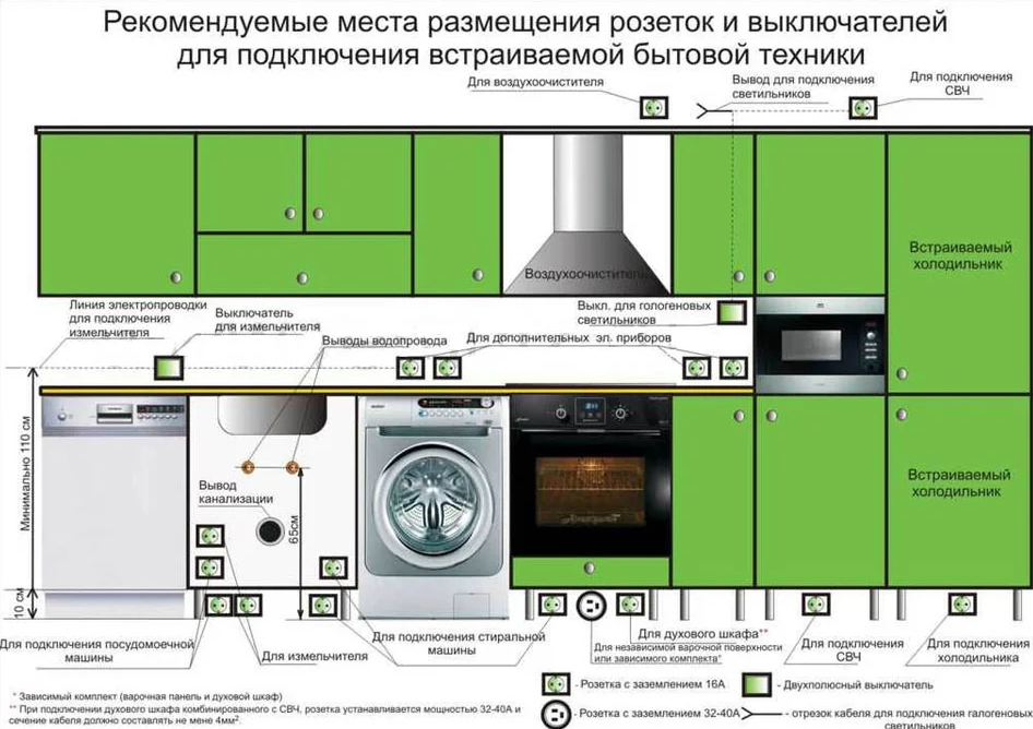 В этом помещении сосредоточено до половины, а иной раз и больше, общего количества домашней техники. При этом часть техники является встроенной или стационарной, с частью работают исключительно на столе. Поэтому вопрос расположения розеток на кухне – схема и высота размещения – стоит рассмотреть отдельно.