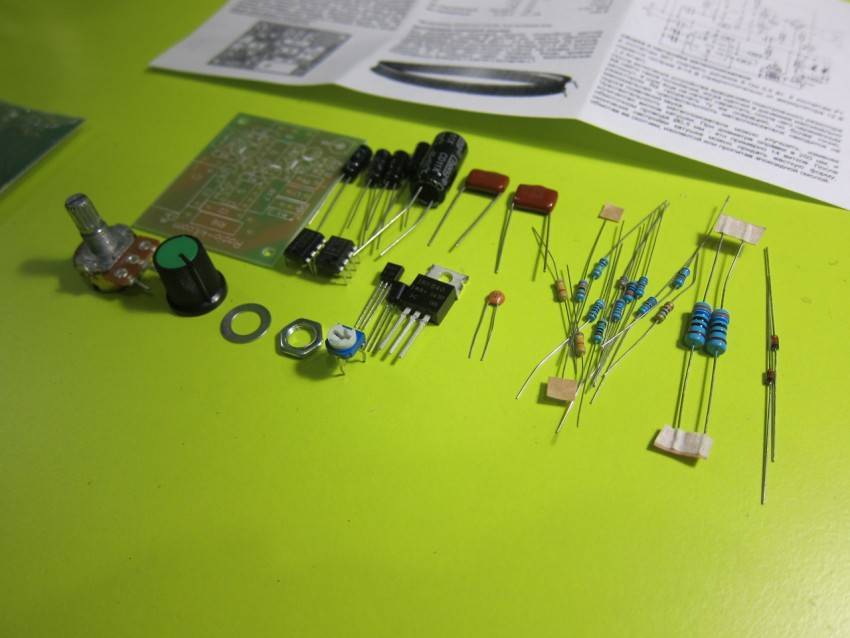 Номинальные параметры, количество зависят от выбранной принципиальной схемы прибора. Для сборки приведенных элементов потребуется паяльник, набор инструмента (отвертка, плоскогубцы, кусачки пр.), материал для изготовления платы.