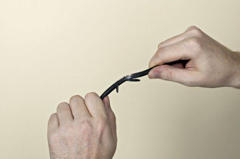 Типичный удлинитель непригоден проведению измерений токовыми клещами. Пример приведен фото. Изоляция питающего провода разорвана, допустимо вести измерения токовым клещами. Фото неспособно послужить примером того, как самому сделать удлинитель идеального типа. В нашем случае применен двухжильный провод, большего не требовалось, розетка взята старого типа, куда диаметром гнезд входят вилки приборов, изготовленных по европейскому стандарту. Помогает избежать сложностей с подключением.