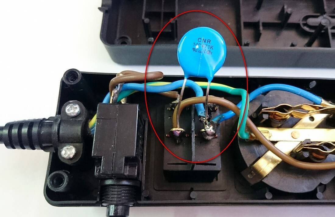 Варистор. Это полупроводниковый прибор, на сопротивление которого влияет сетевое напряжение: чем выше оно поднимается, тем ниже становится сопротивление. Он включается вместе с оборудованием, которое защищает, поэтому к его выводам прилагается такое же напряжение, как и к вашей технике.