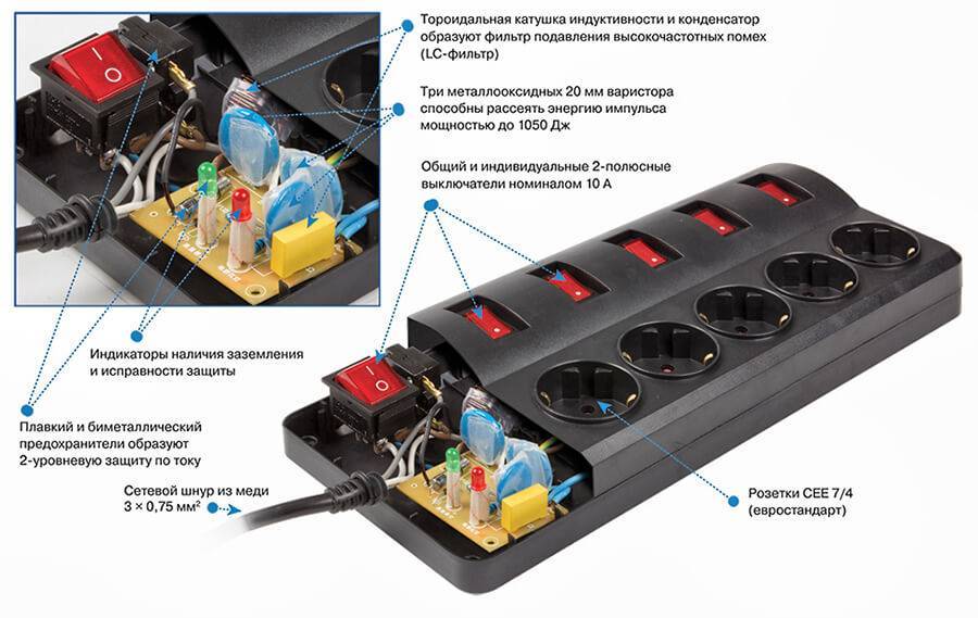 Чтобы понять, каким образом сетевой фильтр может защитить технику, стоит разобраться, из чего он состоит и как работает.