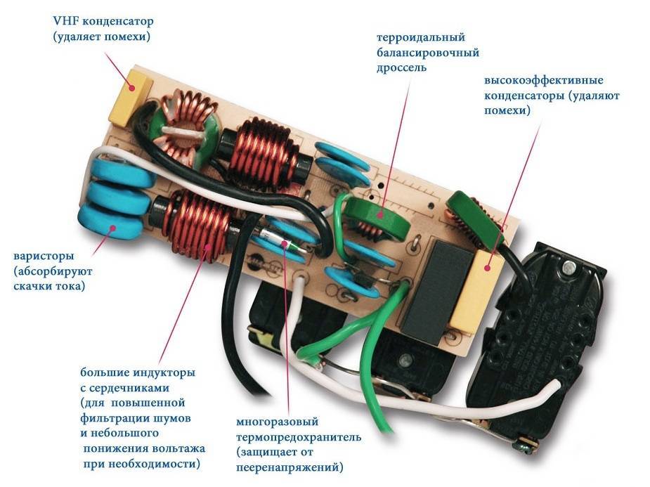 LC-фильтр. Его назначение — подавление высокочастотных помех (от 100 Гц до такого же количества Ггц). Их может вызвать сосед, делающий ремонт с перфоратором или сварочным аппаратом, расположенная рядом стройка с включенным генератором и т. п.